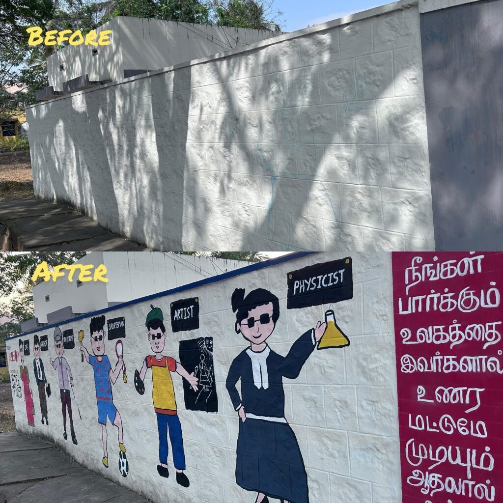 BTG Trust proudly implemented the “Coloring Dreams” Wall Painting Initiative at Thondamuthur Government School for the Visually Challenged, bringing color, creativity, and inspiration into the lives of 16 students. This unique project aimed to transform the school’s blank walls into a vibrant, inclusive environment through professionally themed cartoon artwork. Each painting depicted a different career path—from doctors and dancers to engineers and artists—symbolizing the limitless potential of visually challenged students. Designed to be tactile and narrative-driven, the paintings allowed students to engage through touch and storytelling. Volunteers from BTG Trust and various colleges came together to paint, collaborate, and celebrate with the children. The project fostered inclusion, promoted community participation, and created joyful learning spaces. A cake-cutting ceremony added happiness to the event, turning it into a celebration of imagination and hope. The initiative sparked motivation among students and provided an inspiring model for similar projects. With each brushstroke, the project conveyed a powerful message: that dreams are valid, no matter how they are seen or felt. It uplifted spirits, built bridges between communities, and opened new ways of seeing the world. This initiative stands as a testament to the power of art, compassion, and collaboration.