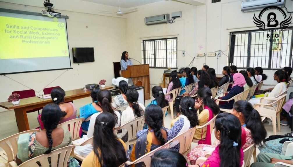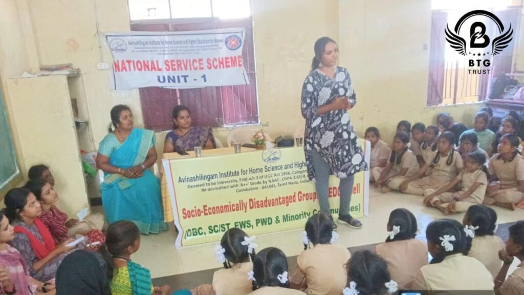 BTG Trust proudly participated in the Alumni Interaction Meeting 2025 at Avinashilingam Institute of Home Science and Higher Education for Women, Coimbatore. The event engaged 80 students on the topic “Skill and Competencies of Social Work Extension and Rural Development Professionals.” Ms. Bhavithra S., Senior Project Coordinator at BTG Trust, represented the organization and shared her impactful field experiences. The session emphasized the essential skills required in social work, community engagement, rural development, and extension work. Key discussion areas included leadership, communication, problem-solving, teamwork, and adaptability. Students gained practical insights into real-world challenges and career opportunities. Bhavithra spoke about project coordination, fundraising, and field realities. The event aimed to bridge the gap between academic learning and professional practice. It inspired students through alumni success stories. Career pathways in the social sector were explained in depth. The session encouraged students to pursue internships and volunteering opportunities. Emphasis was placed on capacity-building workshops for skill enhancement. The interaction highlighted the importance of professional competencies. Students were motivated to explore diverse roles in social development. BTG Trust’s involvement helped foster knowledge sharing and industry connection.